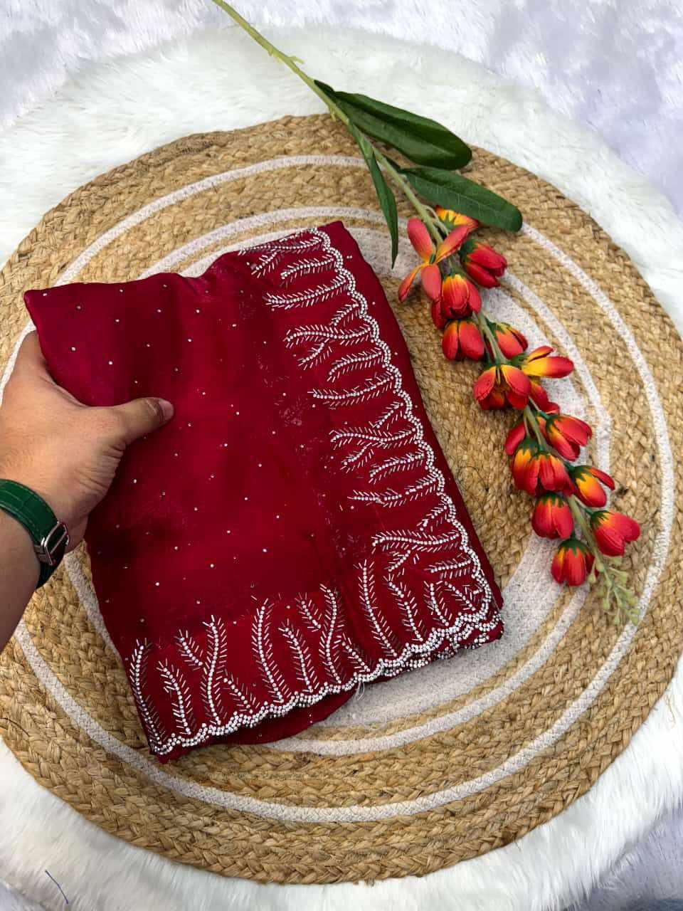 SAREES: Fandy satin silk with val moti jarkhand